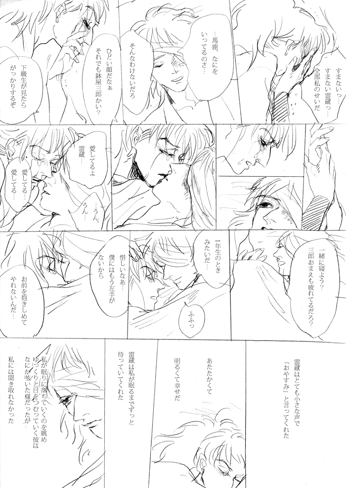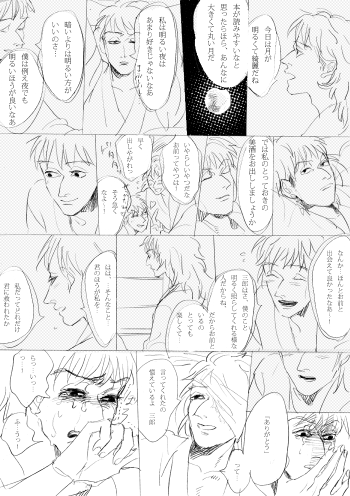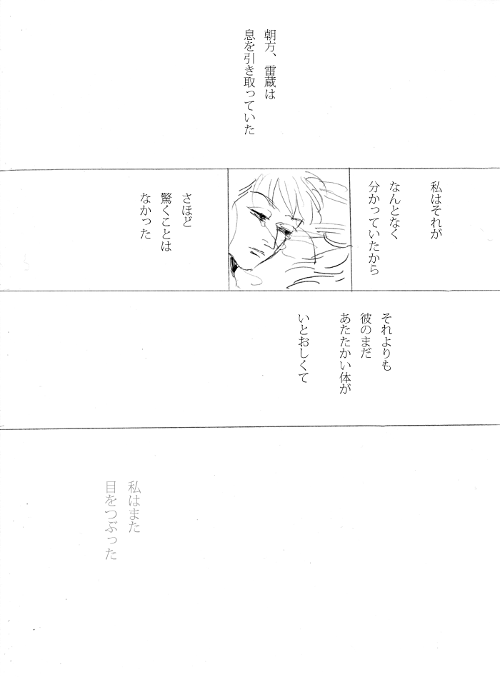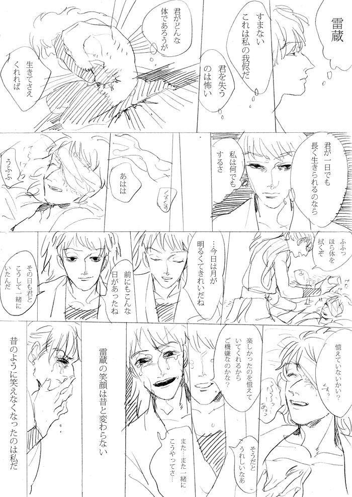 雷蔵が先にいっちゃったら三郎はどうなるんだろうなあ…と考えながら描いてました。 いろいろ妄想しすぎて号泣しながら描きました…情緒不安定過ぎますね…爆 雷蔵はちゃんと三郎にお別れをいってから旅立つと思います。 逆に三郎はひっそり隠れて死んじゃいそうですね。雷蔵に見つけられると思いますが… 三郎の情けない面を見て正気に戻ってお別れをいって旅立つ雷蔵=純愛鉢雷の象徴
